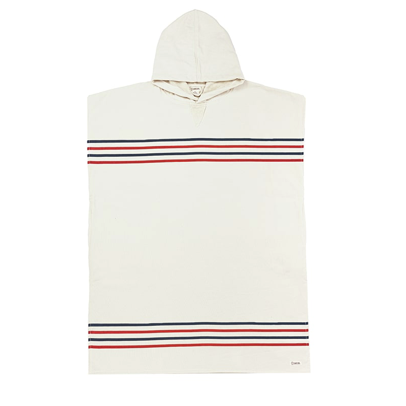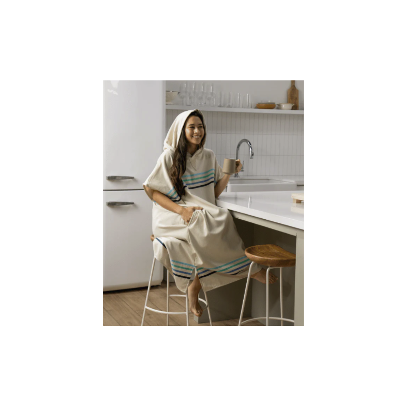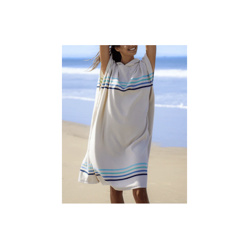 The Sand Cloud Stripe Hooded Poncho is the perfect companion for your beach moments. Ideal after a surf session, a shower, relaxing at home, or on cool beach days, this black hooded poncho features a classic striped design. It is made from 100% organic Turkish cotton, lightweight, and multifunctional.